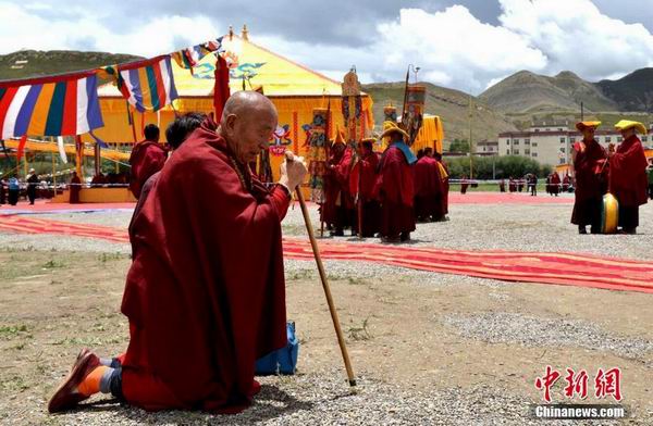 此事發(fā)生在西藏日喀則,說(shuō)具體點(diǎn)就是班禪時(shí)輪金剛灌頂法會(huì)現(xiàn)場(chǎng)。7月23日,記者親眼看到,有位老人特別顯眼,他身著的僧袍與周?chē)刈迳勐杂胁煌,不像是藏區(qū)的。中午12點(diǎn)一過(guò),他就跪在班禪大師必經(jīng)之地的黃色蓮花寶毯旁。別人告訴他,班禪為信眾灌頂要到下午兩點(diǎn)才開(kāi)始,氣溫這么高,趕緊起來(lái),到陰涼處等候,別跪壞了身子。