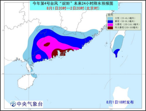 從風力來看,根據預報,8月1日20時至2日20時,南海北部的大部海面、廣東中東部沿海及珠三角地區(qū)將有9-12級大風,“妮妲”中心經過的附近海面和地區(qū)風力13-15級,陣風可達16級。從降水來看,廣東珠三角及東部沿海地區(qū)局地有特大暴雨(250~350毫米)。
