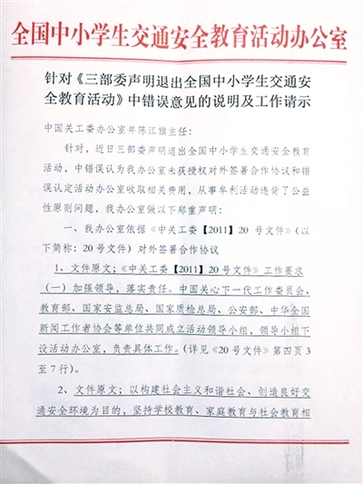 這份名為“針對《三部委聲明退出全國中小學(xué)生交通安全教育活動(dòng)》中錯(cuò)誤意見的說明及工作請示”中,首先回應(yīng)了“未獲三部委授權(quán)”的質(zhì)疑,稱安全教育辦公室是依據(jù)中國關(guān)工委[2011]20號文件對外簽署的協(xié)議,“按照指導(dǎo)思想聯(lián)合社會(huì)各界共同開展學(xué)生教育工作,為明確合作雙方的責(zé)、權(quán)、利,必然要簽署合作協(xié)議。”