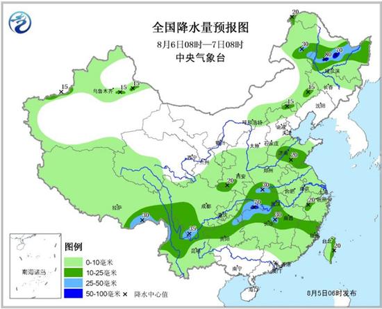 8月6日08時至8月7日08時,內(nèi)蒙古東北部、黑龍江中部、黃淮東部、江淮西部、江漢、江南北部和 東南部、四川盆地南部、云南北部、貴州中北部等地有中到大雨,其中,黑龍江中部、湖南北部的局地有暴雨(50~80毫米);上述部分地區(qū)伴有短時強(qiáng)降水、 雷暴大風(fēng)或冰雹等強(qiáng)對流天氣。