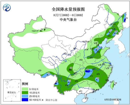 8月7日08時至8月8日08時,東北地區(qū)中南部和東北部、華北東部、黃淮北部、江南東南部和西部、 江漢、西南地區(qū)南部、西藏東南部等地有中到大雨,其中,黑龍江東北部和湖南北部等地的局地有暴雨(50~90毫米);上述部分地區(qū)伴有短時強(qiáng)降水、雷暴大 風(fēng)或冰雹等強(qiáng)對流天氣。