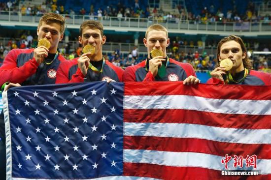 8月13日,在里約奧運(yùn)會(huì)游泳賽場(chǎng)最后一天的比賽中,菲爾普斯領(lǐng)銜的美國(guó)隊(duì)在男子4X100米混合泳接力決賽中,獲得冠軍,這塊金牌成為菲爾普斯的奧運(yùn)會(huì)第23金,完美收官。中國(guó)隊(duì)因?yàn)榉敢?guī)被取消成績(jī)。圖為美國(guó)隊(duì)集體吻金牌慶祝。中新網(wǎng)記者 富田 攝