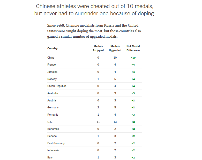 《紐約時(shí)報(bào)》公布了一組官方數(shù)據(jù),奧運(yùn)獎(jiǎng)牌獲得者中被發(fā)現(xiàn)使用興奮劑最多的是俄羅斯和美國。而中國從沒因?yàn)榕d奮劑問題被剝奪任何一塊獎(jiǎng)牌。相反,中國是被“騙走”獎(jiǎng)牌最多的國家,有10位中國選手因?yàn)閷?duì)手嗑藥被“偷走”獎(jiǎng)牌。