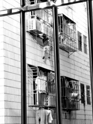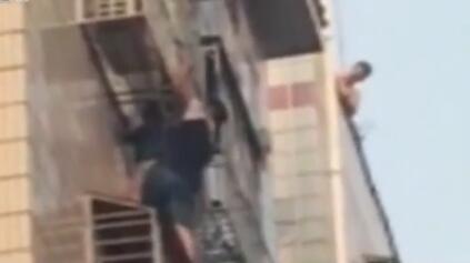 千鈞一發(fā)之際,一名30歲左右的男子沖出人群,將鞋一脫,背包一甩,沿著防護欄不到兩分鐘就徒手爬上了五樓,并迅速移動到男孩身邊。熱心男子雙腳踩著五樓的防盜網(wǎng),左手拉著防盜網(wǎng)借力,右手不停敲擊卡著男孩的六樓防盜網(wǎng),并試圖將孩子推上去。