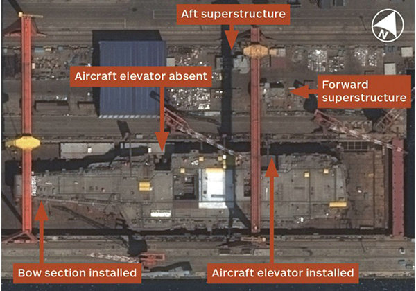 《簡(jiǎn)氏防務(wù)周刊》認(rèn)為,這些大型模塊的存在,可證明航艦的組裝將于近期內(nèi)完成。