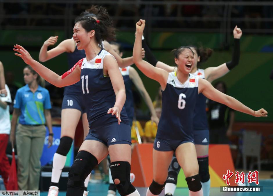 當?shù)貢r間8月18日,2016里約奧運會女排半決賽,中國隊3:1戰(zhàn)勝荷蘭隊晉級決賽。這是中國女排時隔12年再次進入奧運決賽。圖為中國姑娘慶祝勝利。