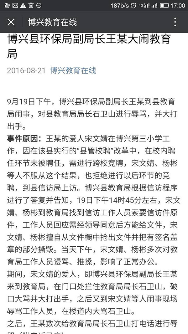 8月21日,山東省濱州市博興縣教育局在其官方微信“博興教育在線”,發(fā)布題為《博興縣環(huán)保局副局長(zhǎng)王某大鬧教育局》的文章,稱8月19日下午,博興縣環(huán)保局副局長(zhǎng)王某到縣教育局鬧事,對(duì)博興縣教育局局長(zhǎng)石衛(wèi)山進(jìn)行辱罵,并大打出手。