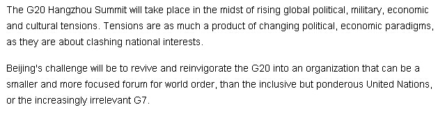 中國(guó)目前面臨的挑戰(zhàn)是如何振興二十國(guó)集團(tuán)(G20),將其打造為一個(gè)規(guī)模雖小卻更專注于維護(hù)世界秩序的機(jī)構(gòu)。尤其是在當(dāng)下,聯(lián)合國(guó)雖然包容性強(qiáng),但機(jī)構(gòu)沉悶,缺乏活力,而七國(guó)集團(tuán)(G7)又在不斷被邊緣化。