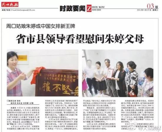 《周口晚報》23日就刊發(fā)了新聞《省市縣領(lǐng)導(dǎo)看望慰問朱婷父母》。