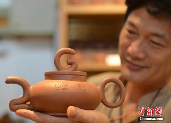 資料圖:8月3日,紫砂壺技藝傳承人展示制作完成的“G20元素”壺。時(shí)間進(jìn)入8月,二十國(guó)集團(tuán)(G20)杭州峰會(huì)腳步愈發(fā)臨近,附有G20元素的手工品似乎成了手工傳承人們的“必修課”,各式各樣的產(chǎn)品讓原本不起眼的原材料變得異常鮮活。中新社記者 張茵 攝
