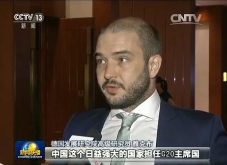 德國發(fā)展研究院 高級研究員雅克布:讓中國這個(gè)日益強(qiáng)大的國家擔(dān)任G20主席國是一件非常好的事,我們也將看到杭州峰會的討論成果,我對此抱有很大的期待。