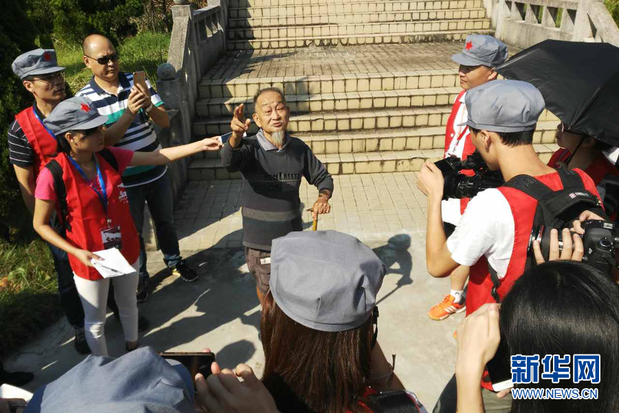 圖為30日上午,一位80多歲的當(dāng)?shù)卮迕駨埨辖o媒體團(tuán)講當(dāng)年紅軍長征激烈戰(zhàn)斗后戰(zhàn)場上的情況。新華網(wǎng)記者 盧鑒攝