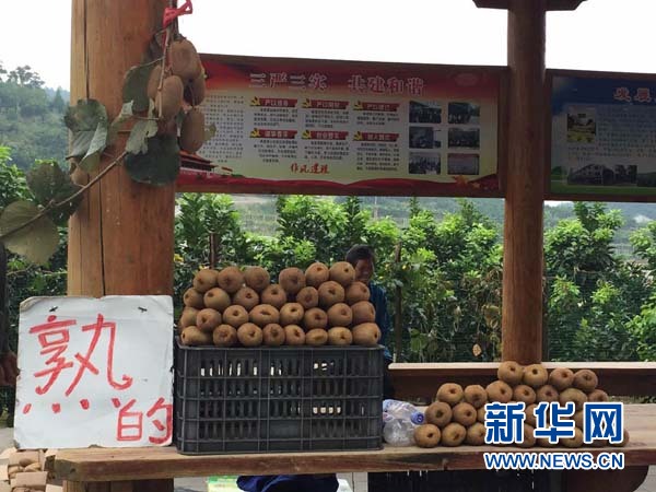 圖為菖蒲塘村村民在馬路沿線售賣已經成熟的紅心獼猴桃。新華網 王瑩 攝