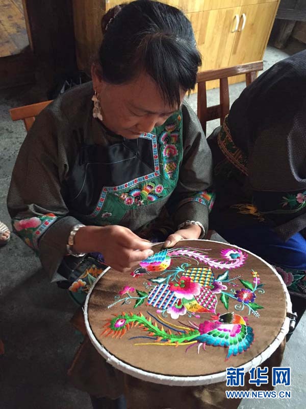 圖為花垣縣十八洞村留守婦女吳阿姨參加苗繡生產。新華網 王瑩 攝