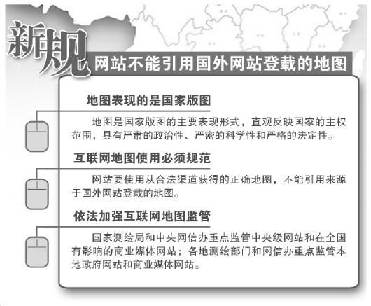 他說,問題包括部分互聯(lián)網(wǎng)網(wǎng)站中登載的地圖未依法履行地圖審核程序,相關(guān)地圖存在將我國臺灣省按獨(dú)立國家表示、錯(cuò)繪我國國界線、漏繪南海諸島、釣魚島等重大錯(cuò)誤;同時(shí),部分地圖上登載了不宜公開甚至涉密的內(nèi)容,如國防、軍事設(shè)施、未經(jīng)公開的港口、機(jī)場,未經(jīng)國家批準(zhǔn)公開發(fā)表的各項(xiàng)經(jīng)濟(jì)建設(shè)的數(shù)據(jù)等涉及國家秘密的內(nèi)容。