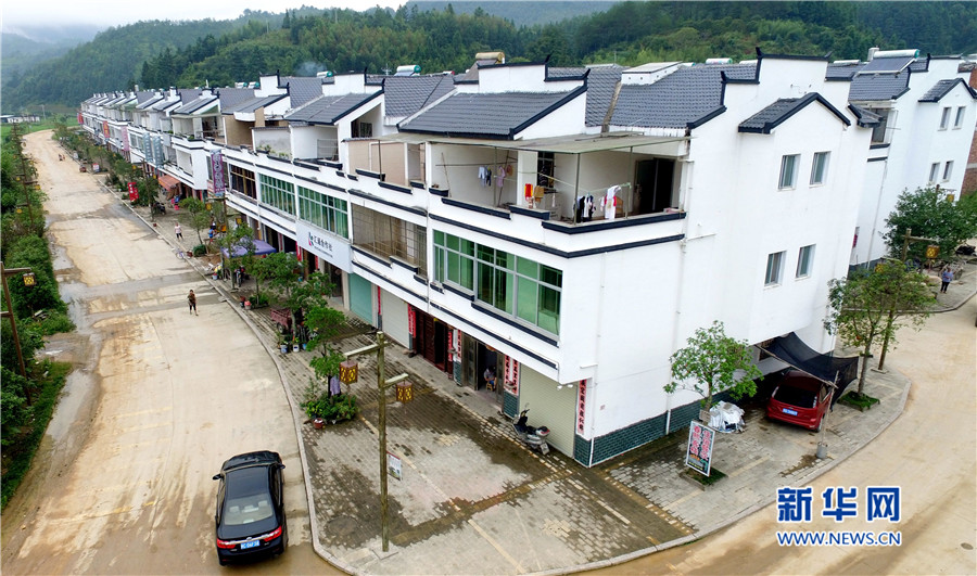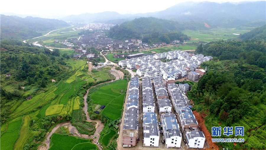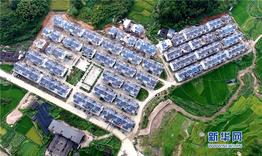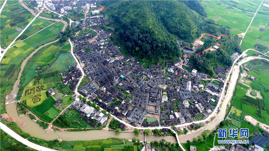 培田新村現(xiàn)規(guī)劃兩期,有住戶150戶,解決了當?shù)匚奈锉Wo與村民改善居住條件需求的矛盾。圖為徽派風格的培田新村別墅群俯拍圖。