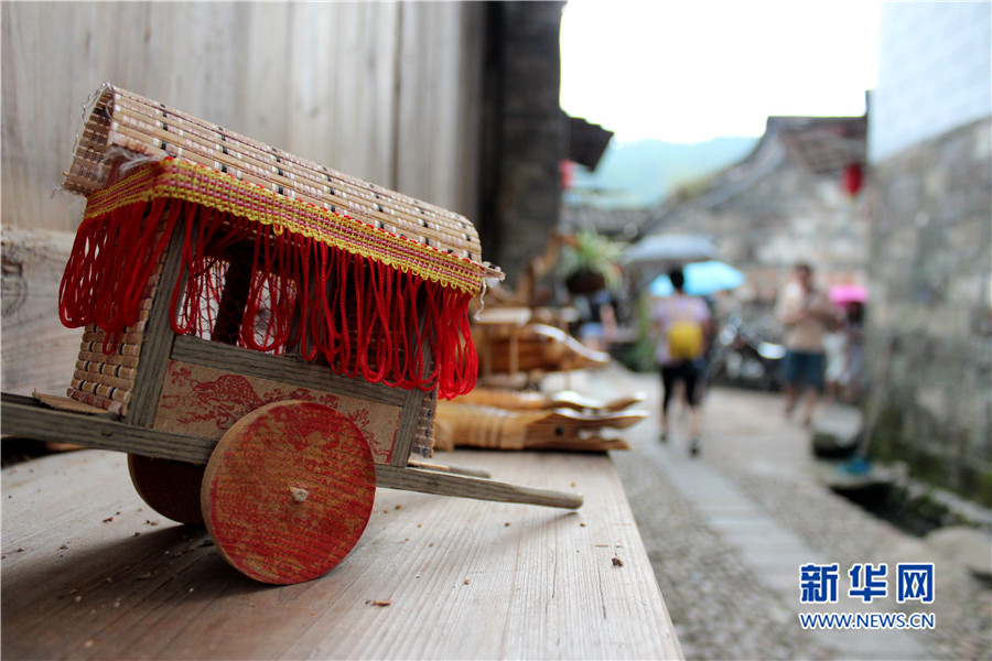 2015年,培田村吸引全國游客達到15萬人左右,為當?shù)貛砹舜罅康娜藲夂拓敋。圖為當?shù)卮迕皲N售的手工玩具。