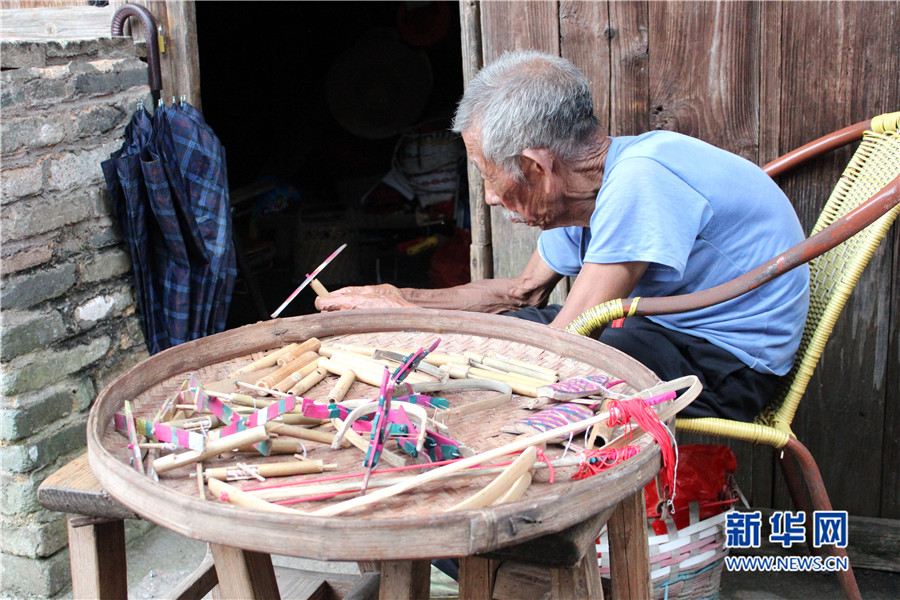 2015年,培田村吸引全國游客達到15萬人左右,為當?shù)貛砹舜罅康娜藲夂拓敋。圖為一位擺攤老人在整理竹蜻蜓。