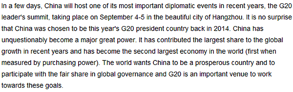 幾天后,中國將在美麗的杭州舉辦二十國集團(tuán)(G20)峰會(huì)。2014年,中國被選為今年G20峰會(huì)的舉辦地,這并不令人驚訝。毫無疑問,作為世界大國,中國對全球經(jīng)濟(jì)發(fā)展做出了很大貢獻(xiàn),并且也成為了世界第二大經(jīng)濟(jì)體(如果按照購買力平價(jià)計(jì)算,甚至已經(jīng)成為世界第一大經(jīng)濟(jì)體)。國際社會(huì)希望看到一個(gè)繁榮的中國,并且希望中國能夠參與到全球治理當(dāng)中,而G20則是實(shí)現(xiàn)這些目標(biāo)的重要平臺。