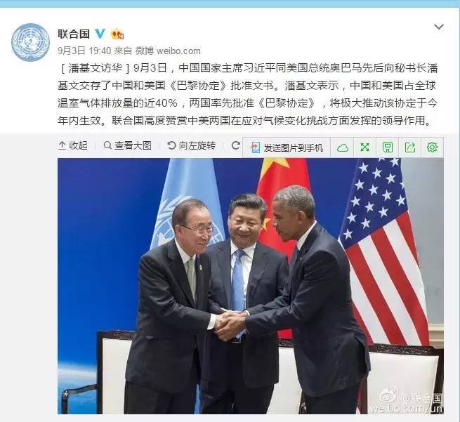 《巴黎協(xié)定》批準(zhǔn)文書(shū)交存儀式后,@聯(lián)合國(guó) 官方微博也特意發(fā)了兩條微博,為中美兩國(guó)的表率之舉點(diǎn)贊!