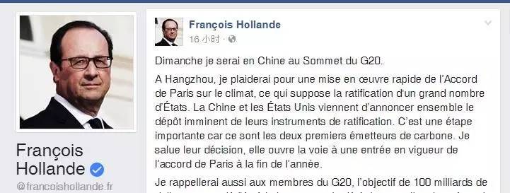 法國(guó)總統(tǒng)奧朗德在Facebook上發(fā)布信息稱,對(duì)中美兩國(guó)的決定表示歡迎。他認(rèn)為,中美雙雙批準(zhǔn)《巴黎協(xié)定》是“具有重要意義的一步”,為促進(jìn)該協(xié)定在年底生效拓寬了道路。