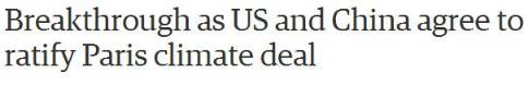 英國(guó)衛(wèi)報(bào)用了“突破性進(jìn)展”的標(biāo)題來(lái)描述中美加入巴黎協(xié)定。