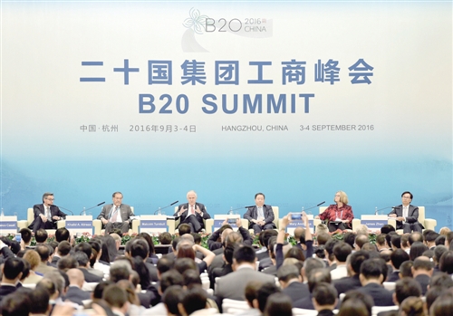 9月4日,澳大利亞總理特恩布爾(左三)在研討會上發(fā)言。當(dāng)日,二十國集團工商峰會在浙江杭州舉辦“實現(xiàn)強勁的國際貿(mào)易和投資”專題研討。 新華社記者 李 鑫攝