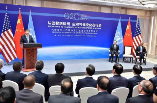 9月3日17時30分許,杭州西湖國賓館如意廳,中美兩國元首先后向聯(lián)合國秘書長潘基文交存氣候變化《巴黎協(xié)定》批準文書。
