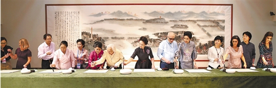 在觀看完“意象中國”書畫展后,夫人們在美院美術(shù)館二樓中廳,欣賞4位著名書畫家現(xiàn)場聯(lián)袂創(chuàng)作書畫作品《江南憶》。