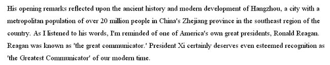 習(xí)主席在開幕詞中,回顧了杭州悠久的歷史,談到了杭州的現(xiàn)代發(fā)展。聽他致辭時,我想起了一位偉大的美國總統(tǒng)——羅納德 里根(Ronald Reagan)。里根總統(tǒng)被譽(yù)為“偉大的溝通者”。而習(xí)主席完全稱得上是我們當(dāng)代“最偉大的溝通者”。