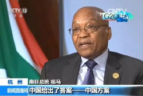 南非總統(tǒng)祖馬表示,作為非洲國家的代表,他很贊同G20杭州峰會上習(xí)主席提出的全球治理的中國方案,他認(rèn)為這不僅會促進非洲經(jīng)濟的增長,也為全球經(jīng)濟增長做出貢獻。