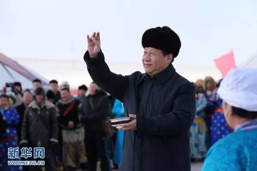2014年春節(jié)前夕,習(xí)近平赴內(nèi)蒙古調(diào)研。在錫林浩特市寶力根蘇木(鄉(xiāng))冬季那達(dá)慕“五畜祈!眱x式上,習(xí)近平按照蒙古族習(xí)俗,用無(wú)名指蘸上銀碗盛著的鮮牛奶彈了三下,祝福來(lái)年風(fēng)調(diào)雨順,五畜興旺,人民幸福安康。