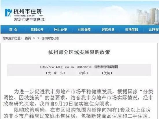繼今年的“房價四小龍”蘇州、廈門、合肥、南京等熱點二線城市先后出臺樓市調(diào)控政策之后,杭州也伸出了調(diào)控之手。18日,杭州市住房保障和房產(chǎn)管理局公布了《杭州部分區(qū)域?qū)嵤┫拶徴摺,宣布?月19日起實施住房限購,在市區(qū)限購范圍內(nèi)暫停向擁有1套及以上住房的非本市戶籍居民家庭出售住房。