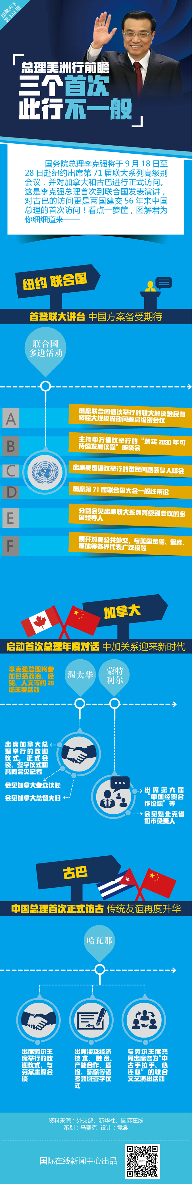 李克強(qiáng)18日下午乘專機(jī)離京,赴紐約聯(lián)合國總部出席第71屆聯(lián)合國大會(huì)系列高級(jí)別會(huì)議,并對(duì)加拿大和古巴進(jìn)行正式訪問。這是總理本月第二次出訪行程,也將創(chuàng)下三個(gè)“首次”:李克強(qiáng)總理首次登上聯(lián)大講臺(tái),中國總理13年來首訪加拿大,以及中國總理首次訪問古巴。