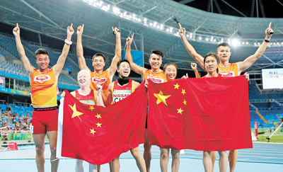 9月14日,里約殘奧會田徑女子4×100米T11—13級決賽,中國運動員奪得金牌后與領(lǐng)跑員一起慶祝。