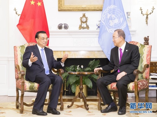 9月19日,國務院總理李克強在紐約會見聯(lián)合國秘書長潘基文。新華社記者 黃敬文 攝