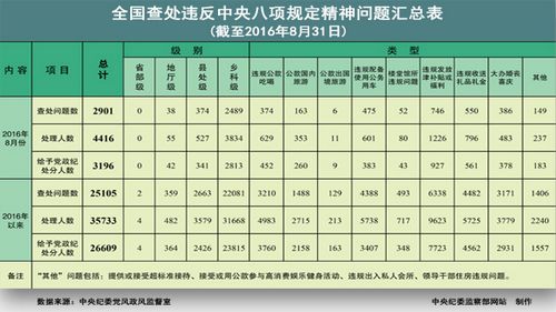 數(shù)據(jù)顯示,2016年8月全國查處違反中央八項規(guī)定精神問題2901起,處理4416人。其中鄉(xiāng)科級干部違反中央八項規(guī)定精神問題比較嚴重,達到2489件。另外,“違規(guī)發(fā)放津補貼或福利”情況最為嚴重,達到746件。