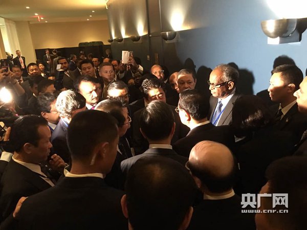 原標題:安倍在聯(lián)大會場外過道處與李克強握手交談