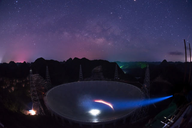 500米口徑球面射電望遠(yuǎn)鏡(FAST)工程在滿天繁星下呈現(xiàn)出的美麗景觀(6月27日攝)。 新華社記者 劉續(xù) 攝