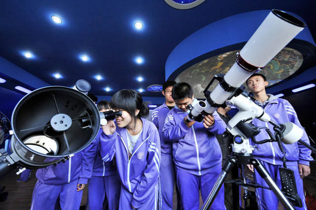 學(xué)生們?cè)谀祥_(kāi)大學(xué)附屬中學(xué)新落成的天文教室里體驗(yàn)各種類(lèi)型的天文望遠(yuǎn)鏡(2011年10月25日)。新華社發(fā)