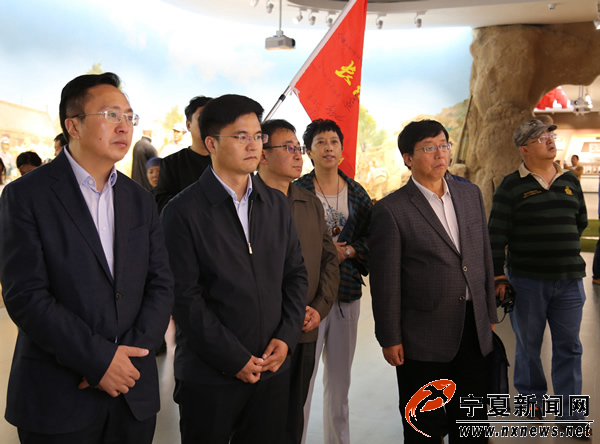 自治區(qū)黨委宣傳部副部長、網信辦主任徐賀(左一)一行參觀六盤山紅軍長征紀念館。