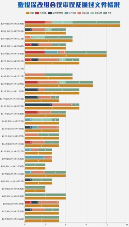 32個(gè)月,27次會(huì)議,接近“每月一次”的召開頻率漸成“慣例”。27次會(huì)議審議及通過的文件情況如何?每次會(huì)議都談及了哪些重點(diǎn)改革領(lǐng)域?