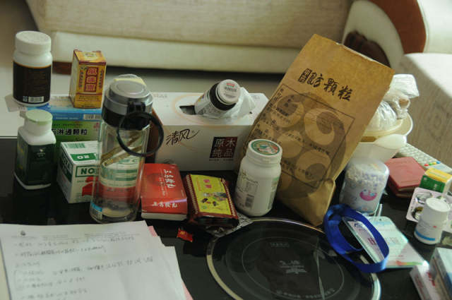 在姜仕坤宿舍里的桌上,除了書(shū)、筆記本外,就是各類(lèi)藥品(7月24日攝) 。新華社記者 李春惠 攝