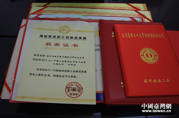 田印福曾獲得“全國職工技術(shù)創(chuàng)新獎”、“海峽兩岸創(chuàng)新成果展金獎”、“遼寧省十大創(chuàng)新成果獎”、“鞍山市科技進(jìn)步獎”等獎項40余項,榮獲“遼寧省節(jié)約環(huán)保標(biāo)兵”、“遼寧省勞動模范”、“遼寧好人”、“全國勞動模范”等諸多稱號,成為享受國務(wù)院特殊津貼的專家。圖為田印福展示的部分榮譽(yù)。(中國臺灣網(wǎng) 李帥 攝)