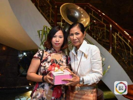泰國旅游和體育部部長科甘(右)向?yàn)橹袊慰途璜I(xiàn)“熊貓血”的南京導(dǎo)游楊莉贈送紀(jì)念品。(新華社記者李芒茫攝)