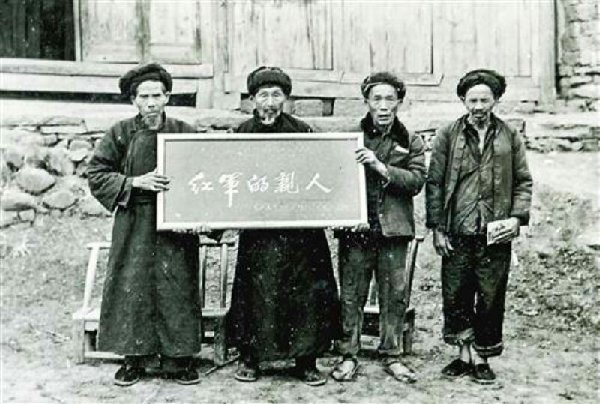 1984年,秀山縣政府向李木富老人(左二)贈送題寫著“紅軍的親人”的匾額(資料照片)。 新華社發(fā)