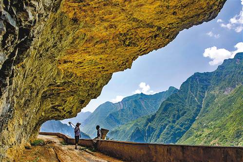 這條路,如一條腰帶,鑲嵌在老虎嘴崖壁上,不僅險象環(huán)生,時常有石塊砸落,在雨天時更是泥濘難行,當?shù)厝朔Q之為“天路”。