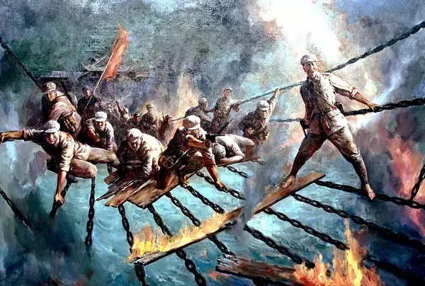22名戰(zhàn)士踩著13根鐵索,如神兵天降,突破了大渡河天險;