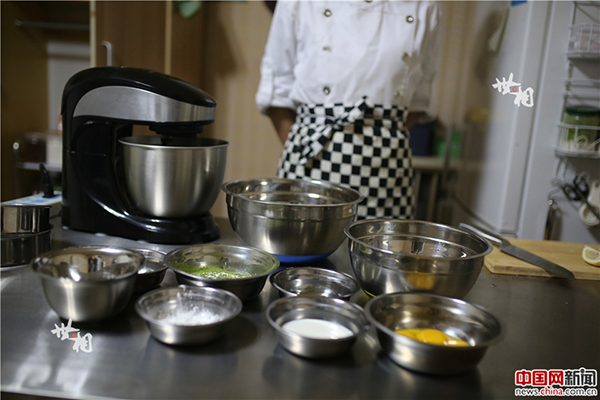 陳騫通過自己課余時間打工掙錢,再加上父母的一些支持資助,購買了電動打蛋器、烤箱、冰箱等器具。圖為烘焙制作前的材料準備。