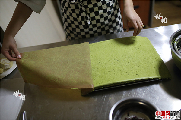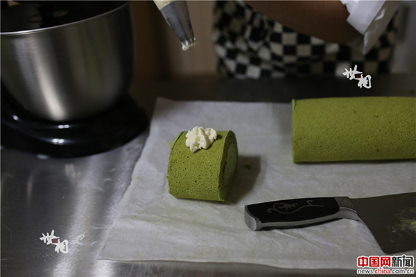 涂抹好奶油卷起來后,再加一些小裝飾,陳騫自創(chuàng)的宇治抹茶紅豆蛋糕卷就做成了。